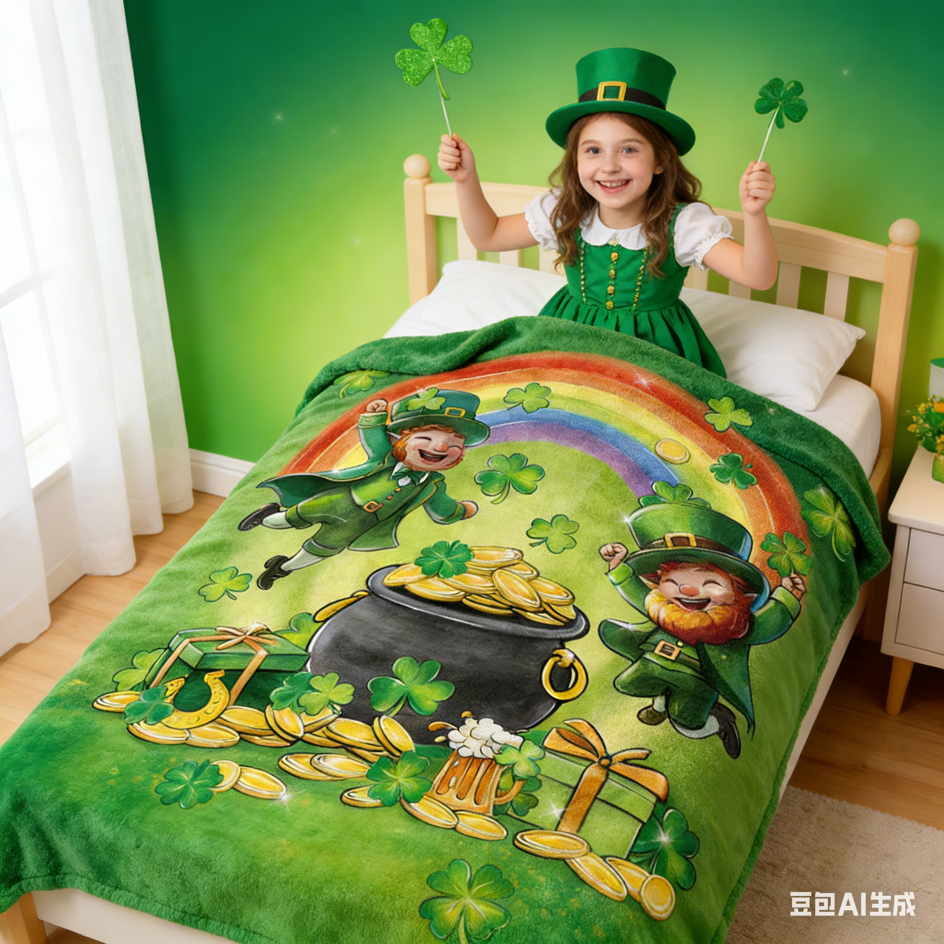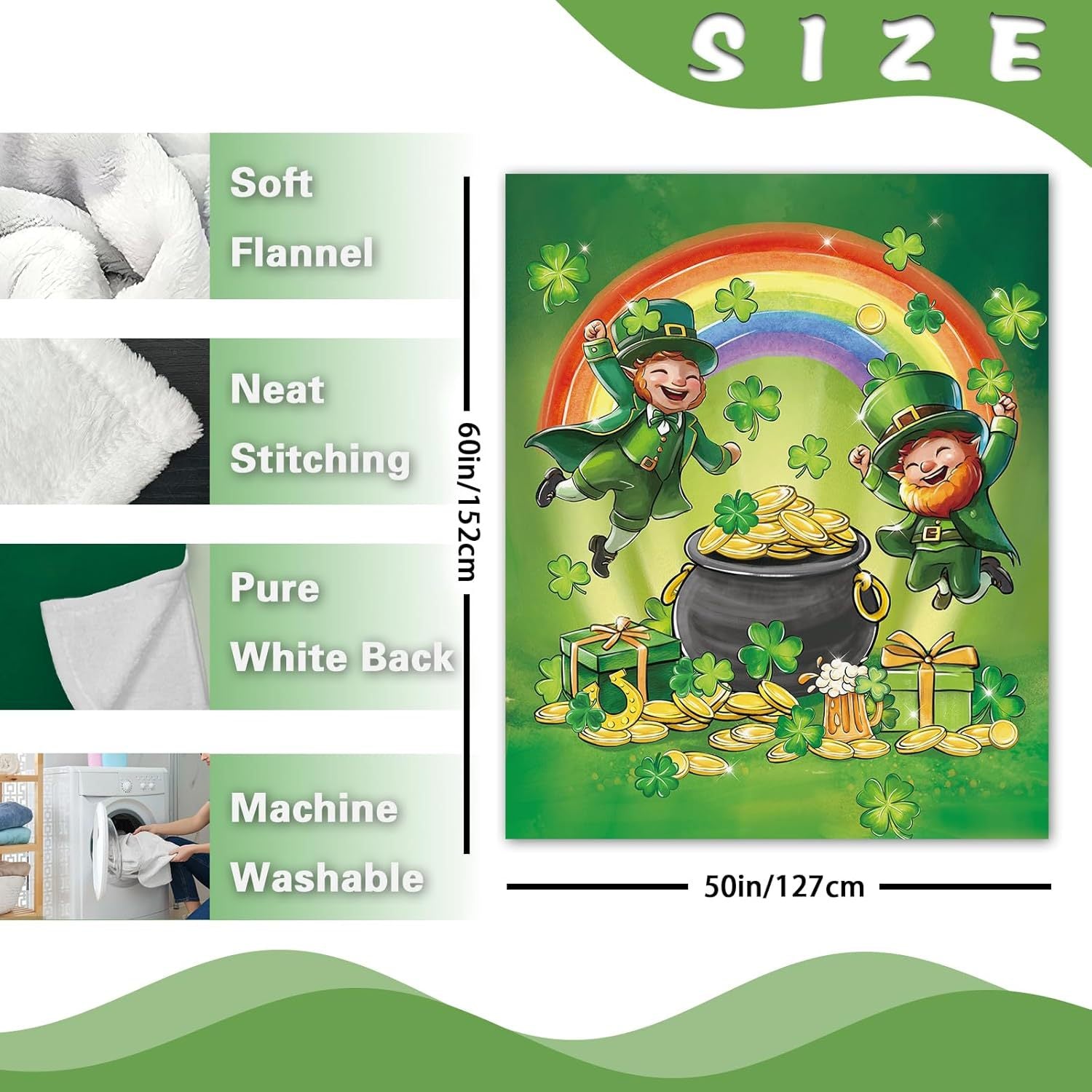 Rooted in symbolic design, this blanket is believed to enhance personal and family feng shui by attracting wealth and good fortune. The pot of gold and leprechauns represent prosperity, while shamrocks symbolize luck, fostering positive energy flow, abundance, and harmony in your home.